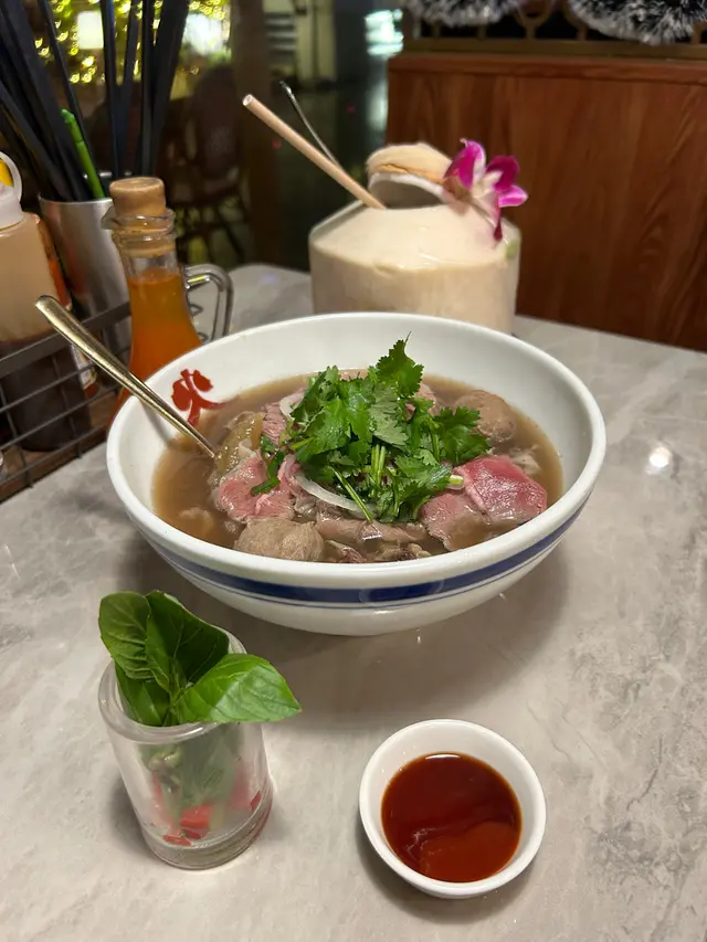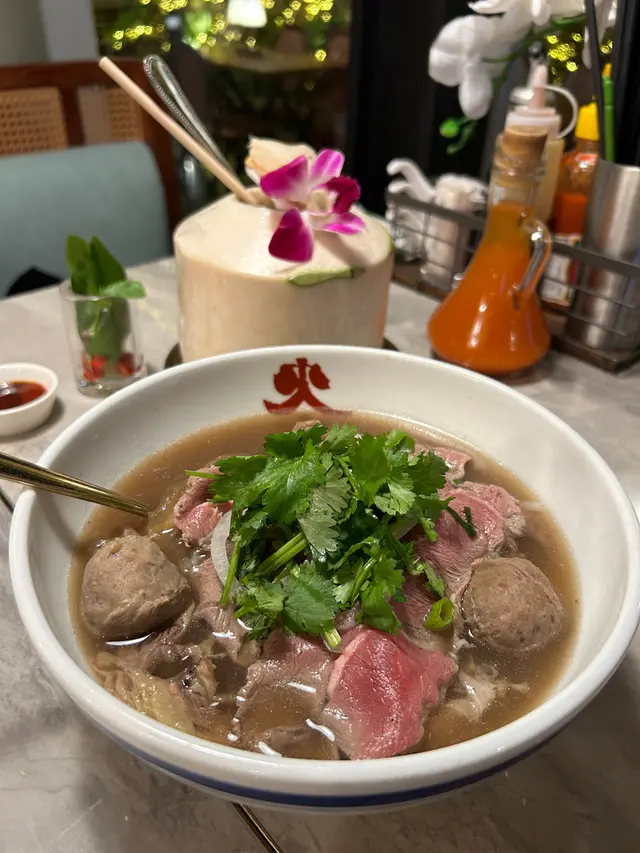 今日來到旺角朗豪坊,見到間越南餐廳頗有情調的,便來試一下。1. 香茅牛肉蝦片炸得金黃酥脆的蝦片上面鋪滿了牛肉,再點綴些許花生碎,配上醃制酸蘿蔔等,吃的時候必須豪邁地一整片拿起,牙齒率先觸及蝦片的清脆,隨即而來的是牛肉的焦香嚼勁,以及香茅獨特的檸檬清香在口中爆開。口感層次豐富,酸甜開胃。2. 法包外脆內軟,香脆可口,咸香是我中意的麵包的口感和味道。3. 牛油果軟殼蟹米紙捲半透明的米紙,包裹著生菜、牛油果、蘿蔔絲,以及最誘人的——炸至金黃的軟殼蟹。蘸上特調的汁,一口咬下,先是米紙那帶有韌性的冰涼口感,接著是牛油果的綿密潤澤,最後是軟殼蟹在齒間香脆。海鮮的鮮、水果的潤、醬汁的酸甜,在口中完美交融,清新而不失滿足感。4. 火車頭招牌湯河醇厚清甜的湯底上面鋪滿了生牛肉片、熟牛肉、牛百葉、牛筋,牛丸等,河粉滑溜順口,絲毫沒有油膩感。5. 鮮椰青最後,新鮮椰青天然的、帶著淡淡奶香的清甜,為此餐畫下了一個清涼圓滿的句點。…查看更多