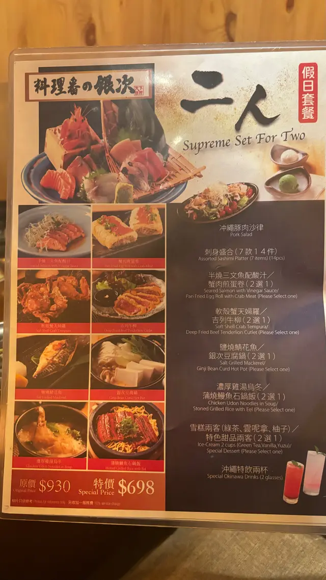 叫了個二人餐原本看到餐牌還心想會不會不夠吃打算吃完這個還再加叫其他食品但是當上菜來到了感覺真的很抵食六百幾元但物超所值說是二人餐但感覺像是三人餐一樣沙律好吃但加了豬肉其實有點奇怪蛋好吃用料足份量十分之足夠以這個價錢來說是很多的味道方面也好吃飯是夠熱的不過豆腐湯就淡了一點魚生正正路路不算突出但不是x鮮那水平炸豬排正爽口的明顯是新鮮炸起來另外個人喜好加飲了支清酒整體而言可以用抵食來說如果情況許可的話下次也會和家人同來…查看更多