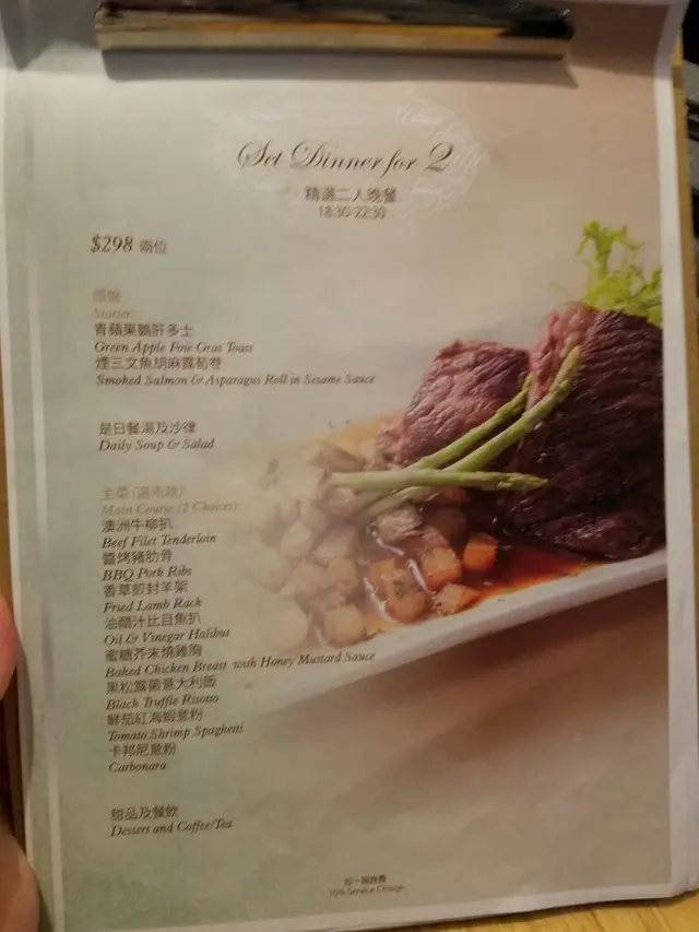 想係旺角搵一個唔限時, 可以慢慢傾計而又有空間既地方真係小之又小, 今次經朋友介紹, 黎到呢間價錢相宜既西餐試下入到去見到有兩個餐揀, 我地想試多D, 所以就揀左$388既SET, 淨係前菜都可以揀3樣, 我地就揀左三文魚露荀, 牛油帆立貝, 鵝肝多士三文魚露荀配上日式胡麻沙律醬汁,醬汁帶起番露荀既清新牛油帆立貝 煎得岩岩好, 無油膩感鵝肝多士 一拎起, 已經有好香既鵝肝味吹入鼻, 入口後溶化, 成個口都充滿鵝肝既香味清新沙律加日式胡麻沙律醬汁, 剛好清清味雷準備主菜雜菌蘑姑湯 呢個湯比較失色, 略為稀蜜糖芥末燒雞胸個醬汁味道好特別, 可惜雞略為煮太熟, 令到肉質有點鞋, 若然唔係太熟, 呢味菜令人好滿意安格斯肉眼扒我地叫左5成熟, 佢黎到既時候熟度剛剛係我地既要求, 肉質仲係好幼滑, 蔬菜若然可以提供多D就好…查看更多