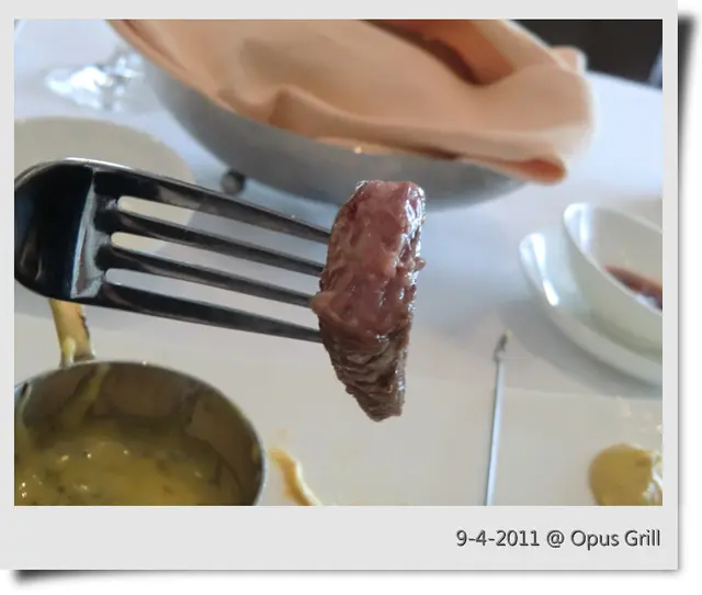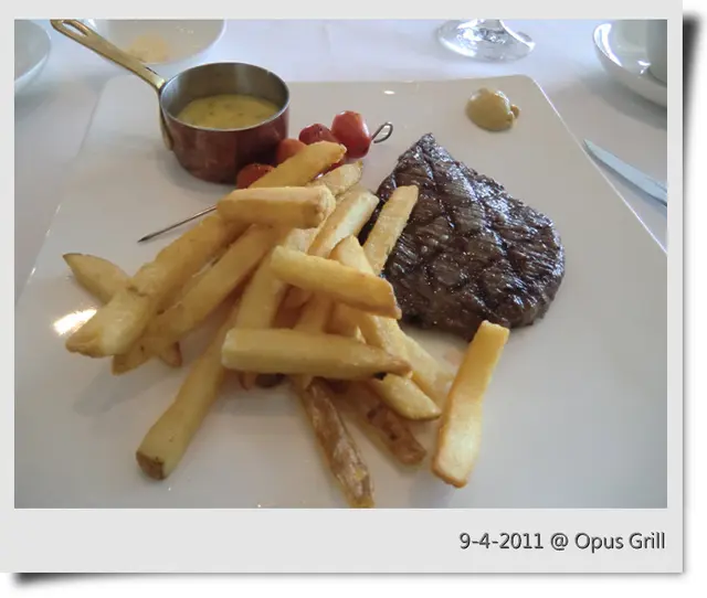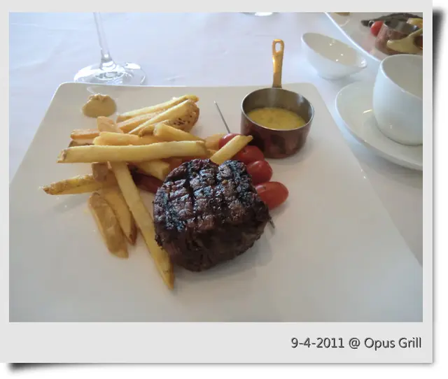 稱心滿意 Opus Grill 2011-04-10為慶祝太太生日,想搵一間特色啲o既食肆,呢度應該係一個好選擇。一早訂咗位,雖然係下午1:00食飯時間,但人客唔多,不過,侍應都唔多。先叫一支紅酒,可能係前酒吧後餐廳,酒o既款式好多。由於不精於此道,隨便揀選一支叫 ROSSO 2005 o既紅酒。初入口時,酒味較淡,但越飲越有味。為呢一餐揭開序幕!同太太倆個都叫咗 Executive Lunch,因為價錢似乎比較抵食啲。不過,大家都加錢轉咗主菜,分別係 6 oz USDA Fillet Mignon 同 5 oz Blackmore Iron Steak。先嚟兩款麵包:一款麥包、一款似鬆餅o既麵包麥包比較有嚼口,而且麥味香濃,深得太太喜愛。鬆餅麵包冇特色唔特別。前菜係 Beef Tartare 同 Greek SaladBeef Tartare 以前未食過,本來對生牛肉有啲抗拒,但食落發覺口感同質感真係幾特別,帶嚟唔少驚喜。Greek Salad 裏面有好多青瓜、橄欖,平時好少食,因為青瓜帶有好強烈o既草青味,而橄欖則有澀味。但呢個 Greek Salad 完全食唔出草青同澀味 :) 感覺好清新Fillet Mignon 有少少 overcooked,不過,肉質仍然保持唔韌,仲好有牛肉味。Blackmore Iron Steak 入口有好濃o既炭燒味,但一啲燶味都冇。脂肪似乎偏多,不過,被火燒去多餘油份之後,令牛肉帶有一份甘香。唔需要加任何芥末醬,已經非常可口。配菜薯條炸得香脆,更加係喜愛o既粗薯條,正!另有一串車厘茄,可能曾經燒過,帶出更強o既甜味。是日甜品係芝士餅。食落真係冇乜特別~~餐飲點咗咖啡,比預期中濃郁。用o既咖啡糖,唔係方糖或者紙包糖,反而係形狀古怪、原始o既咖啡糖,夠特別!優優閒閒,享受一餐高水準o既午餐,人生一大樂事!…查看更多+ 7以上食評乃用戶個人意見 , 並不代表OpenRice之觀點。讚好分享稱心滿意 Opus Grill https://s.openrice.com/QrbT0tzsG00檢舉 張貼 評分4味道4環境4服務4衛生4抵食推介美食美味紅酒美味紅酒美味麵包感覺新奇o既 Beef tartare草青味盡除o既 Greek Salad造型特別o既利刀Fillet Mignon絕對正斗o既 Blackmore Iron Steak保持嫩滑用餐日期2011-04-09用餐途徑堂食人均消費$647 (午餐)慶祝紀念生日
