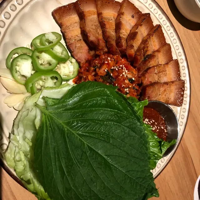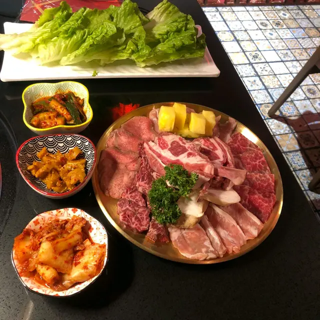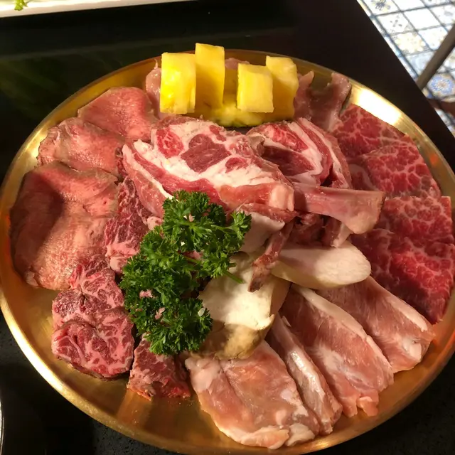 今日我地叫左個燒肉拼盤,兩個人食岩岩好!個拼盤牛、羊、豬、雞全部齊曬,個羊架好油脂感即刻放佢落去燒燒佢,個羊架唔會太SO,之後就有就有牛舌軟脆、牛小排軟嫩多汁、五花腩片油脂平均、雞肉、菠蘿同雞脾菇。我個人就最欣賞牛舌十分之薄食落又淋又爽口!呢間最值得一讚既除左燒肉既質素,重有既係環境同服務。食燒肉最驚就係件衫吸曬啲味或者油濺到件衫,你一坐底就會見到件圍裙,免得你件衫受到油花既攻擊。佢既爐同抽氣好勁,最少我燒完離開唔會有浸燒肉味。環境都坐得好舒服裝修同燈光都好舒服,我地坐係角落都幾靜,傾計一流:)如果想食燒肉又想傾下計就記得去呢間啦~…查看更多